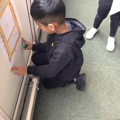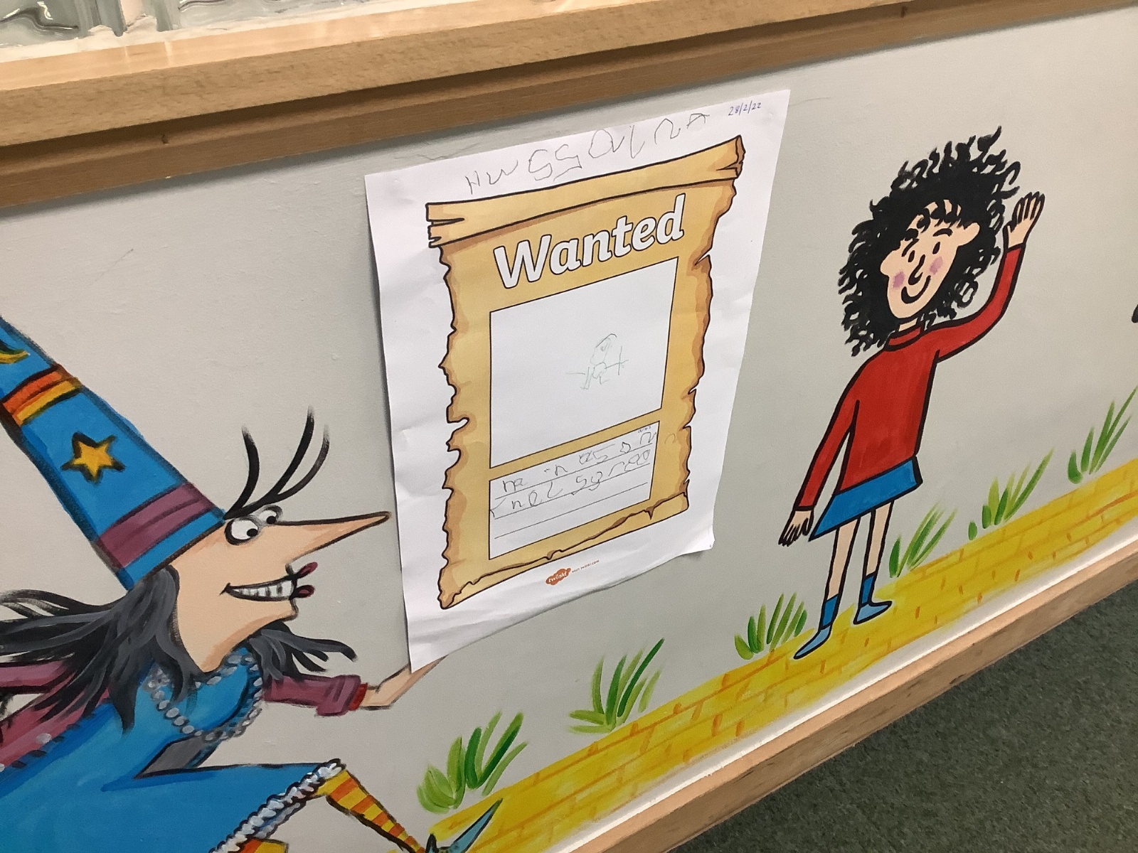"The Evil Pea" has been causing trouble in the Reception classrooms. On Monday he captured all the fruit in the home corner and trapped them in a basket! Today he has hung the snack basket in the air and trapped all the fruit in the netting! The children in Reception have made wanted posters and put them around the school in their attempt to capture "The Evil Pea." The children have described him - "He is green, he has a red cape and black mask, he can run superfast, he has an evil laugh, and he is evil! If you see him please let us know!!